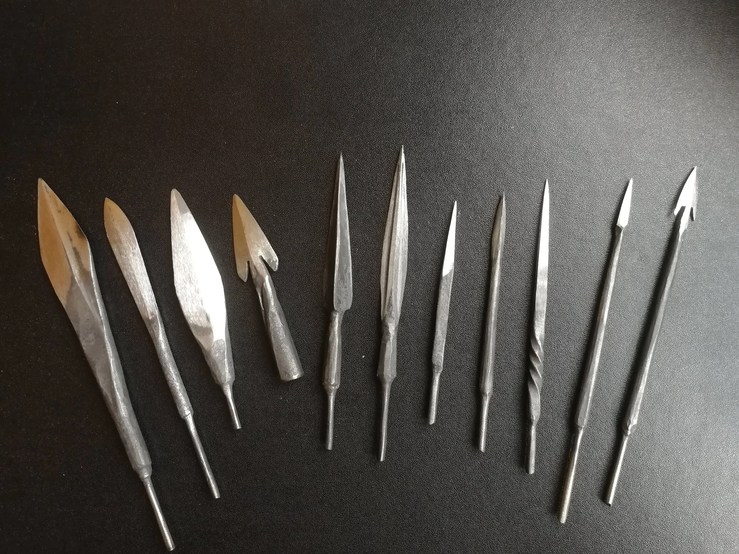 The first task for this project was to acquire the arrowheads. This was in a time that Viking had not yet become a massive public craze. And the task of finding someone selling these heads was nigh on impossible. As such I turned to a local blacksmith friend of mine. We spent about half a year talking these heads over and coming up with measurements and the nine corroded design.